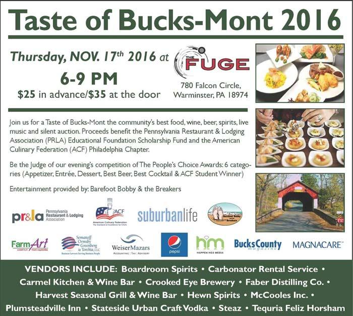 The Taste of Bucks-Mont, at The Fuge in Warminster, PA on Thursday, November 17th from 6pm-9pm will feature the community’s best food from 30 plus vendors including craft brews and distilleries, live music by Barefoot Bobby and the Breakers, and silent auction.  All proceeds go to the Educational Scholarship Funds of the PRLA and the American Culinary Federation (ACF) Philadelphia Chapter. The Event will include the People’s Choice awards to be chosen in various competition areas plus a “mystery basket” competition between 4 teams of 4 students each from the ACF programs at Middle Bucks Institute of Technology and North Montco Career and Technical center.  The judging of the “mystery basket” competition will feature Chef Peter Gilmore, formerly of Le Bec-Fin, Gilmore’s French Cuisine where he was named by Zagat Guide as one of the World’s Top Restaurants and Pastry Chef Sam Nahhas of Normandy Farms, winner of the ACF 2015 Pastry Chef of the Year. The evening emcee is Emmy – winning journalist, actor and producer, Mr. Doug Schimell, formerly of NBC 10 Philadelphia.