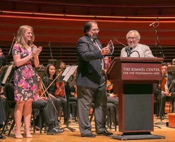 Music teacher Dimitri Kauriga, of Southampton, PA who taught more than 30 years at Philadelphia High School for Girls, had many supporters in the audience when he was named as the grand prize winner in the Fourth Annual Philadelphia Youth Orchestra (PYO) Ovation Award in a surprise presentation. It took place in Verizon Hall at the Kimmel Center on Sunday, June 4, 2017 at 3 p.m. during the 77th Annual Philadelphia Youth Orchestra Festival Concert. The Philadelphia Youth Orchestra’s Ovation Award for Inspiration and Outstanding Leadership in Music Education has been honoring excellence in music instruction since its inaugural year in 2014.