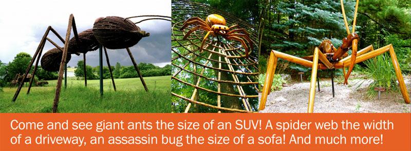 This summer, Tyler Arboretum invites guests to get outdoors and encounter the insect world in a new and surprising way with the exhibit: David Rogers’ BIG BUGS. Dotted along the 1.5 miles of the Arboretum’s Scenic Loop, David Rogers’ BIG BUGS will amaze and delight visitors of all ages as it highlights the outsized role played by these tiny inhabitants of the natural world. Featuring enormous garden sculptures made entirely from natural materials by the Long Island artist David Rogers, BIG BUGS introduces visitors to 17-ft. long dragonfly, 4-ft. wide spider in a 15-ft. web, and invites you to picnics with 25 feet long ants! The exhibit includes ten larger-than-life, anatomically accurate sculptures, accompanied by Education Stations designed to teach and inspire. The following BIG BUGS will be installed among the flower-rich meadows and horticultural collections along Tyler’s paved, 1.5-mile Scenic Loop: